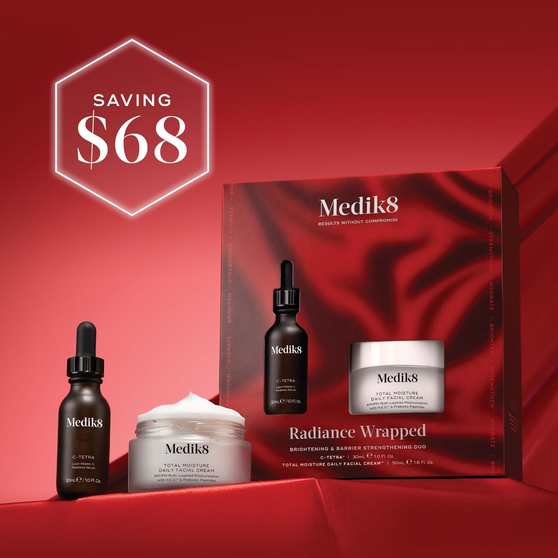 UNWRAP THE SECRET TO VISIBLY BRIGHTER, HEALTHIER-LOOKING SKIN WITH THIS POWERFUL DUO. C-TETRA DELIVERS YOUR DAILY DOSE OF STABILISED VITAMIN C, HELPING TO SHIELD SKIN FROM ENVIRONMENTAL STRESSORS WHILE ENHANCING VISIBLE RADIANCE. TOTAL MOISTURE DAILY FACIAL CREAM LOCKS IN HYDRATION FOR UP TO 100 HOURS, FORTIFYING THE SKIN BARRIER WITH MULTI-LAYERED MOISTURE TECHNOLOGY FOR LONG-LASTING COMFORT. PERFECT FOR PARTY SEASON SKIN PREP.